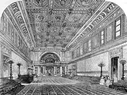 - ↑ Robinson afirma que as decorações, incluindo gessos pendentes e outros motivos decorativos, são "melindrosos" e estão "em desacordo com os detalhes originais de Nash".[16]