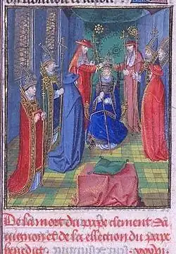 Clemente VII teve como sucessor o Antipapa Bento XIII, eleito no dia 28 de setembro de 1394, que havia prometido demitir-se, se necessário, para pôr termo ao Grande Cisma. A sua persistência em não manter a palavra valeu-lhe uma primeira retirada de obediência por parte da França e dos seus aliados no dia 28 de julho de 1398. O pontífice de Avinhão, fechou-se, então, no seu palácio, onde foi sitiado por Geoffroy le Meingre, alcunhado de Boucicaut, em Setembro.[91]