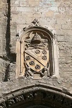 Com esta nova fachada, o palácio tomava o aspecto que lhe conhecemos actualmente. Clemente VI não se esqueceu de mandar colocar a pedra de armas da sua família, os Roger, sobre a entrada principal, por cima do novo portal dos Champeaux. A heráldica descreve assim esse brasão: de prata à banda de azul acompanhada por seis rosas de face, três em chefe em borda, três em ponta de banda.[79]