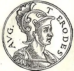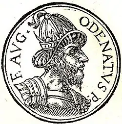 Odenato reuniu então um exército de palmirenos, camponeses e o que restava dos soldados romanos na região, com o objetivo de combater Sapor.[73] Segundo a História Augusta, Odenato autoproclamou-se rei antes dos combates.[74] Os palmirenos obtiveram uma vitória decisiva perto das margens do Eufrates em 260, forçando os persas a retirar. A seguir a essa batalha, um dos oficiais de Valeriano, Macriano Maior (r. 259–261), os seus filhos Quieto e Macriano (r. 260–261) e o prefeito Balista rebelaram-se contra o filho de Valeriano, Galiano (r. 253–268), usurpando o poder imperial na Síria. Em 261, Odenato marchou contra os usurpadores, derrotando e matando Quieto e Balista.[75] Como recompensa, Galiano concedeu-lhe o título de Imperator Totius Orientis ("Governador do Oriente"),[76] ficando com o governo da Síria, Mesopotâmia, Arábia e as regiões orientais da Anatólia como representante imperial.[77][78] Em 262 Odenato empreendeu outra campanha contra Sapor,[79] durante a qual retomou a Mesopotâmia romana (nomeadamente as importantes cidades de Nísibis e Carras), saqueou a cidade judaica de Neardeia.[80] [o] e cercou a capital persa, Ctesifonte.[81] A seguir a estes sucessos militares, o palmireno assumiu o título de "Rei de Reis".[82][p]