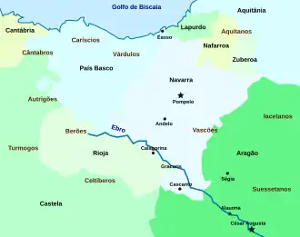 | “ | ...Ύπέρκειται δε τής Ίακκητανιίας πρός άρκτον τό τών Ούασκώνων έθνος, έν ώ πόλις Πομπέλων, ώς άν Πομπηιόπολις.
