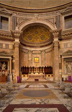 Os atuais altares e absides foram encomendados pelo papa Clemente XI (r. 1700–1721) e projetados por Alessandro Specchi. No santuário na abside acima do altar-mor está um ícone bizantino do século VII da Madona com o Menino doado pelo imperador Focas ao papa Bonifácio IV na ocasião da dedicação do Panteão como igreja cristã em 13 de maio de 609. O coro foi acrescentado em 1840 e é um projeto de Luigi Poletti.