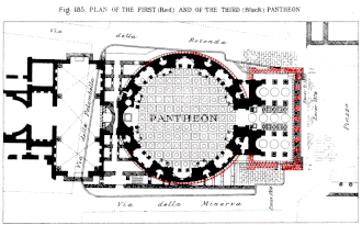 Planta do Panteão. Em vermelho, o Panteão de Agripa e em preto, o Panteão de Adriano. Neste diagrama fica evidente a mudança na orientação do edifício com a mudança de posição do pórtico de entrada.