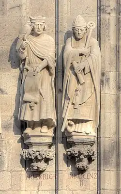 A dinastia da família Hohenstaufen, por outro lado, que ascendeu ao poder com Conrado III (c. 1138-1152), e se tornou a família reinante no Sacro Império nos séculos XII e XIII, defendiam a independência do Sacro Império diante da Igreja.[26] Uma grande inimiga e opositora dos Hohenstaufen foi uma família da Saxônia, os Welfen (ou “Guelfos”), duques da Baviera, Suábia e Francônia. Uma vez que os Hohenstaufen, eram também chamados de Waiblingen (ou “Gibelinos”), nome de sua terra natal, o conflito entre as duas famílias ficou conhecida como “guerra dos guelfos e gibelinos”. Essa competição foi usada posteriormente por Inocêncio.[27]