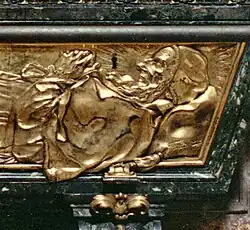 A frente de sua tumba tem uma tampa de bronze dourado que mostra a imagem do papa morto. Na maioria das vezes, é deixada aberta para permitir a veneração dos restos mortais do Papa.