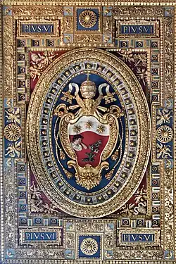 - Interpretação: O escudo obedece às regras heráldicas para os eclesiásticos. O esmalte goles (vermelho) e o metal argente (prata) foram tirados do brasão dos Braschi: "de goles com três rosas de argente". O campo de goles (vermelho) simboliza: o fogo da caridade inflamada no coração do Soberano Pontífice pelo Divino Espírito Santo, que o inspira diretamente do governo supremo da Igreja, bem como valor e o socorro aos necessitados, que o Vigário de Cristo deve dispensar a todos os homens. O lírio é símbolo da pureza e tendo três hastes lembra a Santíssima Trindade e a Sagrada Família, sendo que as expressões "ao natural" e "de sua cor" são recursos para se colocar o lírio e o canteiro, naturalmente com a cor sinopla (verde) sobre o campo de goles (vermelho), sem ferir as leis da heráldica. A cabeça de Éolo representa a graça de Deus que soprou sobre o pontífice eleito, e seu metal argente (prata) simboliza: inocência, castidade, pureza e eloqüência. O chefe de argente tem este mesmo significado e suas três estrelas foram usadas para substituir as três rosas do brasão da família Braschi, simbolizando a Santíssima Trindade e as virtudes teologais: fé, esperança e caridade, sendo de jalde traduzem: nobreza, autoridade, premência, generosidade, ardor e descortínio Os elementos externos do brasão expressam a jurisdição suprema do papa. As duas chaves "decussadas", uma de jalde (ouro) e a outra de argente (prata) são símbolos do poder espiritual e do poder temporal. E são uma referência do poder máximo do Sucessor de Pedro, relatado no Evangelho de São Mateus, que narra que Nosso Senhor Jesus Cristo disse a Pedro: "Dar-te-ei as chaves do reino dos céus, e tudo o que ligares na terra será ligado no céu, e tudo o que desligares na terra, será desligado no céu" (Mt 16, 19). Por conseguinte, as chaves são o símbolo típico do poder dado por Cristo a São Pedro e aos seus sucessores. A tiara papal usada como timbre, recorda, por sua simbologia, os três poderes papais: de Ordem, Jurisdição e Magistério, e sua unidade na mesma pessoa.