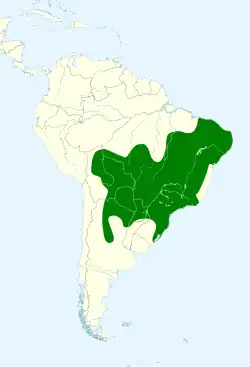 É encontrado na Bolívia, Paraguai e norte da Argentina. No Brasil a ave pode ser encontrada em vários , especialmente nas regiões de mata atlântica e floresta amazônica. Alguns estados onde eles podem ser avistados incluem Amazonas, Pará, Mato Grosso, Bahia e Rio de Janeiro. No entanto, é importante observar que a perda de habitat e o tráfico ilegal de animais representam sérias ameaças à sua população em todo o país.