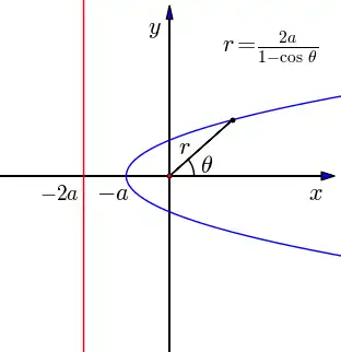 Em coordenadas polares, uma parábola com o foco na origem e reta diretriz é dada pela equação[5]: