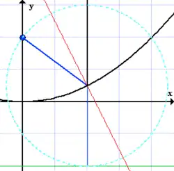 Uma parábola é o conjunto de pontos no plano que são equidistantes de um ponto dado (foco) e uma reta dada (diretriz) que não contém .[3] Assim, em coordenadas cartesianas, uma parábola de foco e reta diretriz tem equação[4]
