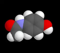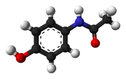 O paracetamolDCI, também conhecido por acetaminofeno e, comercialmente, por Tylenol, Panadol e Ben-u-ron, é um fármaco com propriedades analgésicas e antipiréticas utilizado essencialmente para tratar a febre e a dor leve e moderada,[4] embora existam poucas evidências de que o seu uso seja realmente eficaz no alívio da febre em crianças.[5][6] É geralmente vendido em combinação com outros princípios activos, como nos antitussígenos,[4] ou em medicamentos para o alívio da dor com opiáceos, onde o paracetamol é usado para o alívio da dor severa, como a dor oncológica ou pós-operatória.[7] Geralmente é administrado por via oral embora também esteja disponível para uso por via rectal ou intravenosa, pelo que pode apresentar-se na forma de cápsulas, comprimidos, supositórios ou gotas.[4][8] Os efeitos duram entre duas e quatro horas.[8]