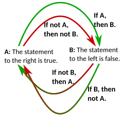 Contradição, juntamente com a autorreferência, é uma característica central de muitos paradoxos.[15] O paradoxo do mentiroso, “Esta declaração é falsa”, demonstra contradição porque a declaração não pode ser falsa e verdadeira ao mesmo tempo.[17] O paradoxo do barbeiro é contraditório porque implica que o barbeiro faz a própria barba se e somente se ele não faz a própria barba.
