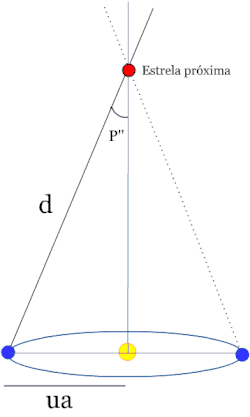 Na prática, através da observação da estrela nas posições A e B, os astrônomos são capazes de medir o ângulo mostrado na figura, que se chama paralaxe. Com esse ângulo e trigonometria, pode-se determinar a distância da estrela.