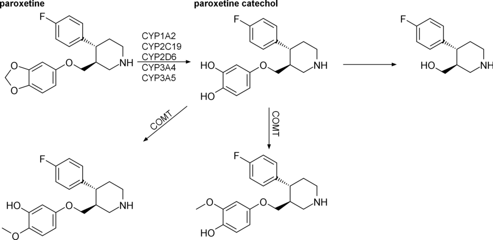 83. 1 2 Jornil J, Jensen KG, Larsen F, Linnet K (março de 2010). «Identification of cytochrome P450 isoforms involved in the metabolism of paroxetine and estimation of their importance for human paroxetine metabolism using a population-based simulator». Drug Metabolism and Disposition. 38 (3): 376–85. PMID 20007670. doi:10.1124/dmd.109.030551