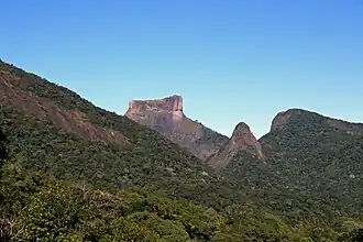 ![]() Floresta da Tijuca com a Pedra da Gávea ao fundo, uma das maiores elevações rochosas da cidade e o maior bloco de pedra a beira mar do planeta, com 842 metros de altitude[1] | |