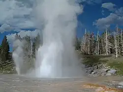 O gêiser mais famoso do parque (um dos mais conhecidos do mundo) denomina-se Old Faithful Geyser. O parque também contém o maior gêiser activo do mundo: o Steamboat Geyser.