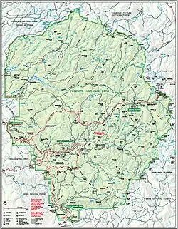 Neste parque de quase 3,1 mil km² existem milhares de lagos e pegos, 2,6 mil km em cursos de água, 1,3 mil km em trilhas para passeios pedestres e 560 km de estradas. Dois rios designados pelas autoridades federais como wild and scenic rivers, o Merced[8] e o Tuolumne, nascem dentro do parque e seguem para oeste para o vale central da Califórnia.[9] Anualmente mais de 3 milhões de pessoas visitam o parque, concentrando-se a maior parte nos 18 km² que constituem o vale de Yosemite.