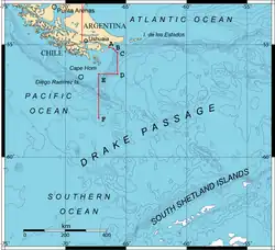 A primeira menção da passagem de um navio pela Passagem de Drake foi a do navio Eendracht do capitão Willem Schouten, em 1616. A passagem, cuja largura é de cerca de 650 km, constitui a distância mais curta entre a Antártica e as outras terras do mundo. Considera-se às vezes que este local, situado no oceano Atlântico e a alguns km da fronteira com o Pacífico, seja a distância marítima mais curta entre o cabo Horn e Snow Island (a 260 km ao norte da parte continental da Antártica). Antigamente, a fronteira era situada sobre o meridiano que passa no cabo Horn. As duas fronteiras situam-se inteiramente na passagem de Drake.
