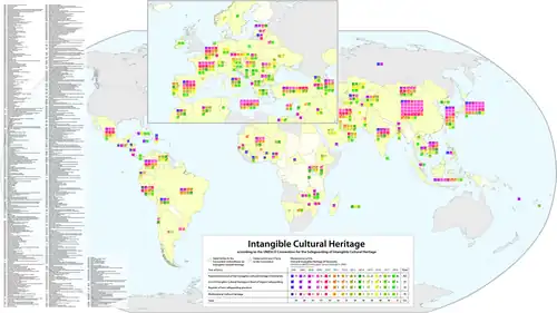 Em resposta a essas demandas, a UNESCO instituiu, em 1997, a categoria Patrimônio Oral e Imaterial da Humanidade, operacionalizada por meio da Proclamação de Obras-Primas do Patrimônio Oral e Imaterial da Humanidade. As proclamações ocorreram em três ciclos (2001, 2003 e 2005), totalizando 90 elementos reconhecidos.[5]