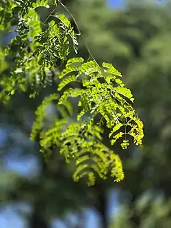 Suas folhas são bipinadas, ou seja, dividem-se duas vezes em forma de penas. A primeira divisão reparte o limbo foliar em 3-20 pares de pinas, com 3-19 folíolos por pina, sendo o número dos folíolos comumente inversamente proporcional ao seu tamanho. [10]