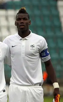 Pogba iniciou sua carreira internacional pela França nas categorias de base. Antes de sua estreia internacional, Pogba foi nomeado capitão da equipe sub-16 pelo técnico Guy Ferrier. Ele fez sua estreia internacional pelas categorias de base em 23 de setembro de 2008, na partida de abertura da campanha contra o País de Gales, em Llanelli. A França venceu a partida por 4 a 2.[170] Sob a liderança de Pogba, a equipe registrou vitórias impressionantes sobre o Uruguai[171] e a Itália[172] no Torneio do Vale do Marne e derrotou a República da Irlanda por um placar agregado de 8 a 2 ao longo de duas partidas.[173][174] Em 31 de janeiro de 2009, ele marcou seu primeiro gol pela base na final da Copa do Egeu de 2009 contra a Noruega. O gol deu à França uma vantagem de 1 a 0 e a equipe venceu a partida por 2 a 1, conquistando o torneio.[175]