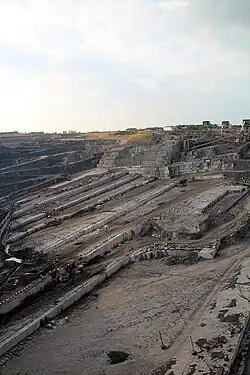 As pedreiras em áreas niveladas têm frequentemente problemas de drenagem. A pedreira de coquina na imagem à direita está escavada a mais de vinte metros abaixo do nível de mar.