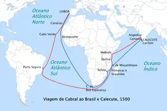 A frota, sob o comando de Cabral, então com 32–33 anos de idade, partiu de Lisboa em 9 de março de 1500 ao meio-dia. No dia anterior, a tripulação tinha recebido uma despedida pública que incluíra uma missa e comemorações com a presença do rei, da corte e de uma enorme multidão.[29][37][38][39][40][41] Na manhã de 14 de março, a frota passou por Grã Canária, a maior das Ilhas Canárias.[39][42] Em seguida, partiu rumo a Cabo Verde, uma colônia portuguesa situada na costa oeste da África, que foi alcançada em 22 de março.[39][43] No dia seguinte, uma nau com 150 homens, comandada por Vasco de Ataíde, desapareceu sem deixar vestígios.[37][39][43] A frota cruzou a Linha do Equador em 9 de abril e navegou rumo a oeste afastando-se o mais possível do continente africano, utilizando uma técnica de navegação conhecida como a volta do mar.[37][44] Os marujos avistaram algas-marinhas no dia 21 de abril, o que os levou a acreditar que estavam próximos da costa. Provou-se estarem certos na tarde do dia seguinte, quarta-feira, 22 de abril de 1500, quando a frota ancorou perto do que Cabral batizou de Monte Pascoal (uma vez que aquela era a semana da Páscoa). O monte localiza-se no que hoje é a costa nordestina do Brasil.[39][44][45][46]