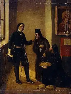 Pintura moderna retratando Pedro vestindo um traje ocidental pela primeira vez diante de sua mãe, do Patriarca de Moscou e de seu tutor, por Nikolai Nevrev, 1903.