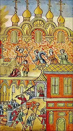 Ivã Miloslavski, Sofia e outros começaram a provocar os Streltsi para criar instabilidade.[24] A revolta estourou em 25 de maio quando dois apoiadores da czarevna espalharam a notícia falsa de que Ivã tinha sido morto pelos Naryshkin, explodindo a fúria dos Streltsi que partiram para o Kremlin com a intenção de matar a família da czarina. O governo foi pego de surpresa e não teve tempo de reação antes da força revoltosa chegar na frente do Palácio das Facetas.[25] Natália apareceu pouco depois no alto das escadas segurando as mãos de Ivã e Pedro para acalmar a agitação; ela tremia assustada, porém o jovem czar permaneceu calmo e não demonstrou medo.[26] Logo em seguida apareceram Matveiev e o patriarca Joaquim, que conversaram com a multidão calma e compreensivamente dizendo que eles tinham sido enganados e não havia motivo de preocupações. Os ânimos pareceram esfriar e os dois homens voltaram para dentro, porém o príncipe Miguel Dolguruki, filho do comandante dos Streltsi, tinha ficado furioso com o incidente e repreendeu asperamente os homens do alto da escada. Isso inflamou o exército novamente e eles partiram escada acima para atacar.[27]