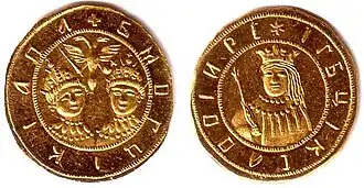 Moeda com os bustos de Pedro e Ivã de um lado, e o de Sofia no outro.