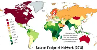 - ↑ Lin, D; Hanscom, L; Murthy, A; Galli, A; Evans, M; Neill, E; Mancini, MS; Martindill, J; Medouar, F-Z; Huang, S; Wackernagel, M. (2018). "Ecological Footprint Accounting for Countries: Updates and Results of the National Footprint Accounts, 2012–2018". Resources. 7(3): 58. https://doi.org/10.3390/resources7030058