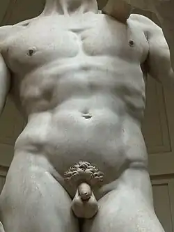 Na arte egípcia antiga, o pelo pubiano feminino é indicado na forma de triângulos pintados.[31]Na arte medieval e clássica européia, os pelos pubianos eram muito raramente descritos, e os pelos pubianos masculinos eram frequentemente, mas nem sempre, omitidos.[32] Às vezes eram retratados de forma estilizada, como foi o caso da arte gráfica grega.[33] O mesmo aconteceu em grande parte da arte indiana e em outros retratos orientais do nu. No século XVI, no sul da Europa, Michelangelo mostrou Davi com pelos pubianos estilizados, mas corpos femininos foram descritos sem pelos abaixo da cabeça. No entanto, os nus masculinos de Michelangelo no teto da Capela Sistina não exibem pelos púbicos. Na Renascença do norte da Europa, os pelos pubianos eram mais propensos a serem retratados do que no sul, mais comumente masculino, enquanto ocasionalmente em figuras femininas.