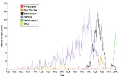 O Espy file,[23] compilado por M. Watt Espy e John Ortiz Smykla, lista 15.269 pessoas executadas nos Estados Unidos e suas colônias predecessoras entre 1608 e 1991. De 1930 a 2002, houve 4.661 execuções nos Estados Unidos, cerca de dois terços delas nos primeiros 20 anos.[24] Além disso, o Exército dos Estados Unidos executou 135 soldados entre 1916 e 1955 (o mais recente).[25][26][27]