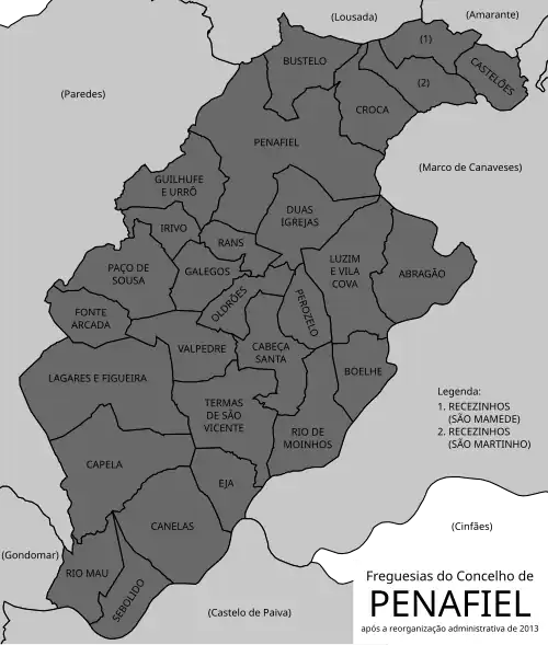 O município de Penafiel divide-se em 28 freguesias, tendo 3 delas o estatuto de vila (Abragão, Paço de Sousa e Rio de Moinhos):