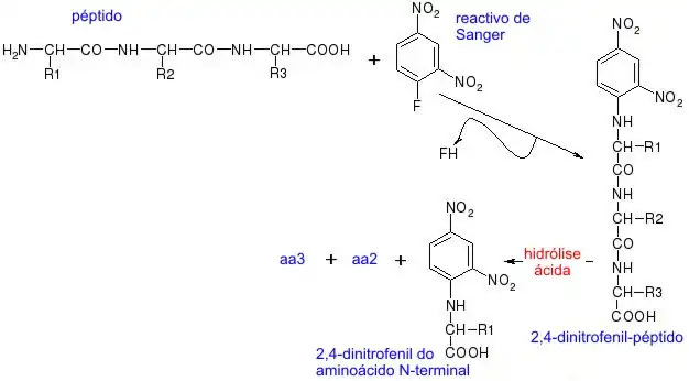 Relativamente às reações do grupo amino, é muito interessante a reação com o reagente de Sanger para sequenciar, já que se tivermos o 2,4-dinitrofenil-péptido e o hidrolizarmos por hidrólise ácida, hidrolizar-se-ão todas as ligações peptídicas e obteremos o dinitrofenil do primeiro aminoácido da sequência, o NH2 terminal, mais o resto dos aminoácidos desagregados no meio. Com esta reação Sanger conseguiu sequenciar a insulina. Nesta reação, o núcleo colorido de dinitrobenzeno liga-se ao átomo de nitrogénio do aminoácido para produzir um derivado amarelo, o derivado 2,4-dinitrofenil ou DNP-aminoácido. O composto DNFB reage com o grupo amino livre da extremidade amino de um polipéptido, bem como com os grupos amino dos aminoácidos livres. A ligação C – N que se forma é geralmente muito mais estável do que uma ligação peptídica. Desta forma, fazendo reagir uma proteína nativa ou um polipéptido intacto com o DNFB, hidrolisando a proteína em ácido e isolando os DNP-aminoácidos coloridos, pode identificar-se o grupo amino terminal do aminoácido numa cadeia polipeptídica. O grupo amino terminal da lisina e alguns outros grupos funcionais das cadeias laterais também reagem com o DNFB. Contudo, depois da hidrólise, apenas o derivado do grupo amino terminal do aminoácido original terá o seu grupo α-amino bloqueado; assim mesmo, tais DNP-α-aminoácidos podem ser separados de outros derivados DNP por meio de procedimentos de extração simples. Com qualquer dos variados métodos cromatográficos poder-se-á identificar os DNP-α-aminoácidos.