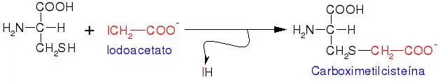 De modo que ao adicionar β-mercapto-etanol, este oxida-se e protege assim os grupos tiólicos da cisteína. Quando queremos estudar a composição de aminoácidos de uma proteína, temos de hidrolisá-la completamente, obtendo uma mistura de todo o conjunto de aminoácidos livres que constituem essa proteína. Para evitar, em toda esta manipulação, que as Cys que tivermos no meio se oxidem, temos de proteger o seu grupo tiólico adicionando como reagente iodoacetato: