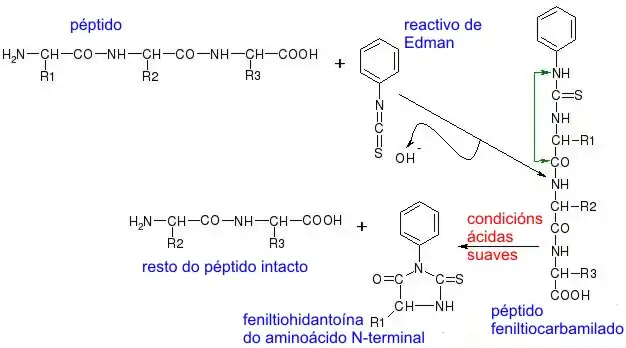Mas este processo consome muita energia, já que, tendo o primeiro aminoácido, é necessário obter os demais rompendo por outras zonas. Isto evita-se com o procedimento de Edman (também é uma reação de aminoácidos): Como a ciclização se dá em condições ácidas suaves, forma-se inicialmente um péptido feniltiocarbamilado, as ligações não se rompem, e origina-se a feniltio-hidantoína do aminoácido NH2-terminal + o resto do péptido intacto.