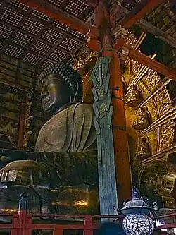Durante o reinado de Shomu, o Tōdai-ji (literalmente Grande Templo Oriental) foi construído, e dentro dele havia o Daibutsu do Grande Buda;[14] uma estátua de ouro e bronze com 16 metros de altura. Esse Buda foi identificado com a Deusa Sol, e um sintetismo gradual do budismo com o xintoísmo surgiu. Shomu declarou-se ele mesmo o "Servo dos Três Tesouros" do budismo: o Buda, a lei ou ensinamentos do budismo e a comunidade budista.