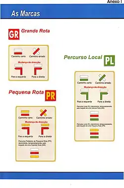 - PR, os Pequena Rota, não excedem os 30 km de extensão ou menos de uma jornada a percorrer, e são sinalizados a amarelo e vermelho.
