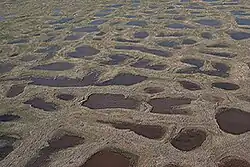 - Corpos de água e caudal de água: corpos d'água, incluindo oceanos, lagos e rios, podem inibir ou aquecer o permafrost em suas imediações. Além disso, a água de superfície tem grandes efeitos nas temperaturas do solo, visto que, as temperaturas médias anuais dos sedimentos no fundo de um lago raso e profundo no Parque Nacional Denali, no Alasca, eram cerca de 8°C, que é 10°C mais quente que a temperatura média do ar. O desenvolvimento do permafrost também é prejudicado por inundações, que podem adicionar calor ao solo e também podem depositar sedimentos que destroem qualquer cobertura isolante de líquen e musgo.[3]