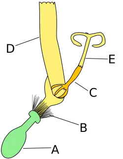 Diagrama mostra as partes de uma flor madura. Neste exemplo o perianto está separado em cálice (sépalas) e corola (pétalas)
