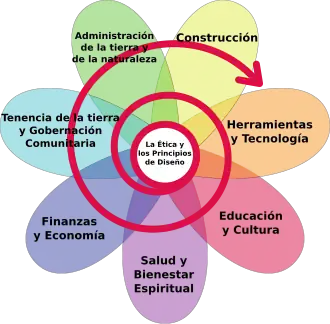 As pétalas são: Manejo da terra e da natureza, Espaço construído, Ferramentas e tecnologias, Cultura e educação, Saúde e bem-estar individual, Economias e finanças, Posse da terra e comunidade.