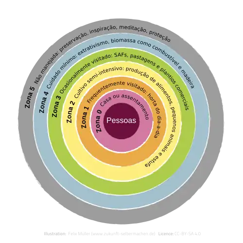 Enfim, a zona cinco é a que não requer nenhum manejo, por ser composta por áreas naturais ou regeneradas e florestas nativas, que servirão de inspiração para o permacultor de como funciona a natureza nesse lugar[1][27][30].
