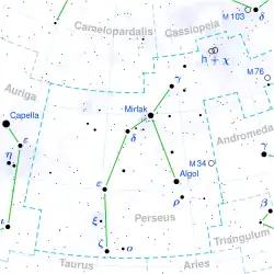 A estrela Algol, cujo nome tem origem no vocabulário árabe e se pronuncia al-gul, é também conhecida por estrela do diabo. É uma estrela muito interessante por variar de brilho de forma muito regular: o ciclo demora exactamente 2 dias, 20 horas e 49 minutos mas, mesmo assim, mantém-se visível a olho nu. É também a estrela desta constelação que está mais próxima da Terra, a 89,22 anos-luz.