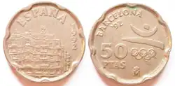 A moeda de 5 pesetas era coloquialmente chamada de "duro" ("peso" em Galego). A moeda de 50 pesetas emitidas entre 1990 e 2000 foram as primeiras com a forma de "Flor Espanhola", lançada em Fevereiro de 2007, hoje usada na moeda de 20 cêntimos de Euro.