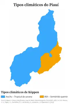 Dois tipos de clima são registrados no Piauí: o tropical com estação seca (Aw), majoritário no estado, com chuvas no verão e invernos secos, temperaturas médias anuais entre 25 e 27°C e precipitação média anual variando de 700 mm no sul e 1200 mm no norte, e o semiárido quente (BSh), no sudeste do estado, com temperaturas médias anuais em torno de 24 a 25°C e precipitações em torno de 600 mm, concentradas no verão e irregulares.[20]