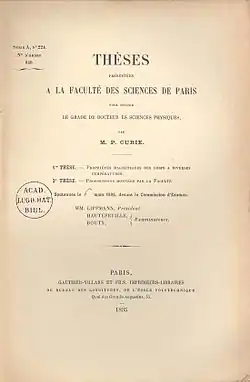• Contractions et dilatations produites par des tensions électriques dans les cristaux hémièdres à faces inclinées, com Jacques Curie, 1881.