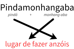 O nome da cidade deriva da frase tupi pindá monhangaba, que significa "lugar onde se fazem anzóis". Analisando cada elemento em separado: o nome do município é formado através da junção das palavras pindá (anzol), monhang (fazer), -ab (sufixo que indica o lugar onde se faz algo) e -a (sufixo substantivador que quase sempre acompanha o sufixo -ab, sendo ambos considerados frequentemente um único sufixo -aba).[13][nota 2]