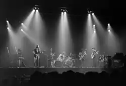Enquanto a banda trabalhava no álbum, Barrett fez uma visita inesperada ao estúdio. Thorgerson lembrou que "ele se sentou e conversou um pouco, mas não estava realmente lá".[138] Ele mudou significativamente na aparência, tanto que a banda não o reconheceu inicialmente. Waters teria ficado profundamente chateado com a experiência.[139][140][141] A maioria de Wish You Were Here estreou em 5 de julho de 1975, em um festival de música ao ar livre em Knebworth. Lançado em setembro, alcançou o número um no Reino Unido e nos Estados Unidos.[141]