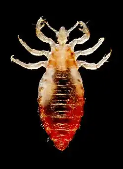 Vista dorsal de um macho de Pediculus humanus var. corporis, notar as cerdas sensoriais, garras, divisões das antenas, comprimento e largura das 6 pernas. O abdome está cheio de sangue ingerido. Foto de 2006.