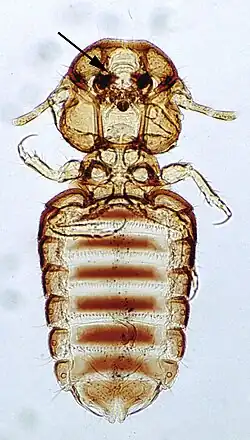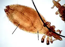 Piolho Linognathus com grandes ovos em desenvolvimento (indicado por setas).